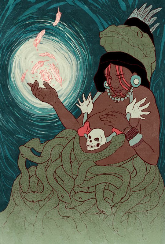 In Aztec mythology, Coatlicue (”she with serpent skirts”) is the mother of the 400 stars in the sky, and one daughter, Coyolxauhqui (”she with bells on her cheeks”). When Coatlicue becomes pregnant illegitimately by touching a tuft of hummingbird feathers, her children become both embarrassed and enraged. But none more so than her daughter, Coyolxauhqui. Together with her 400 brothers, she launches an attack on her mother, but it is foiled when her mother’s unborn son Huitzilopochtli (”the hummingbird on the left”) springs forth from her womb, armed for battle.